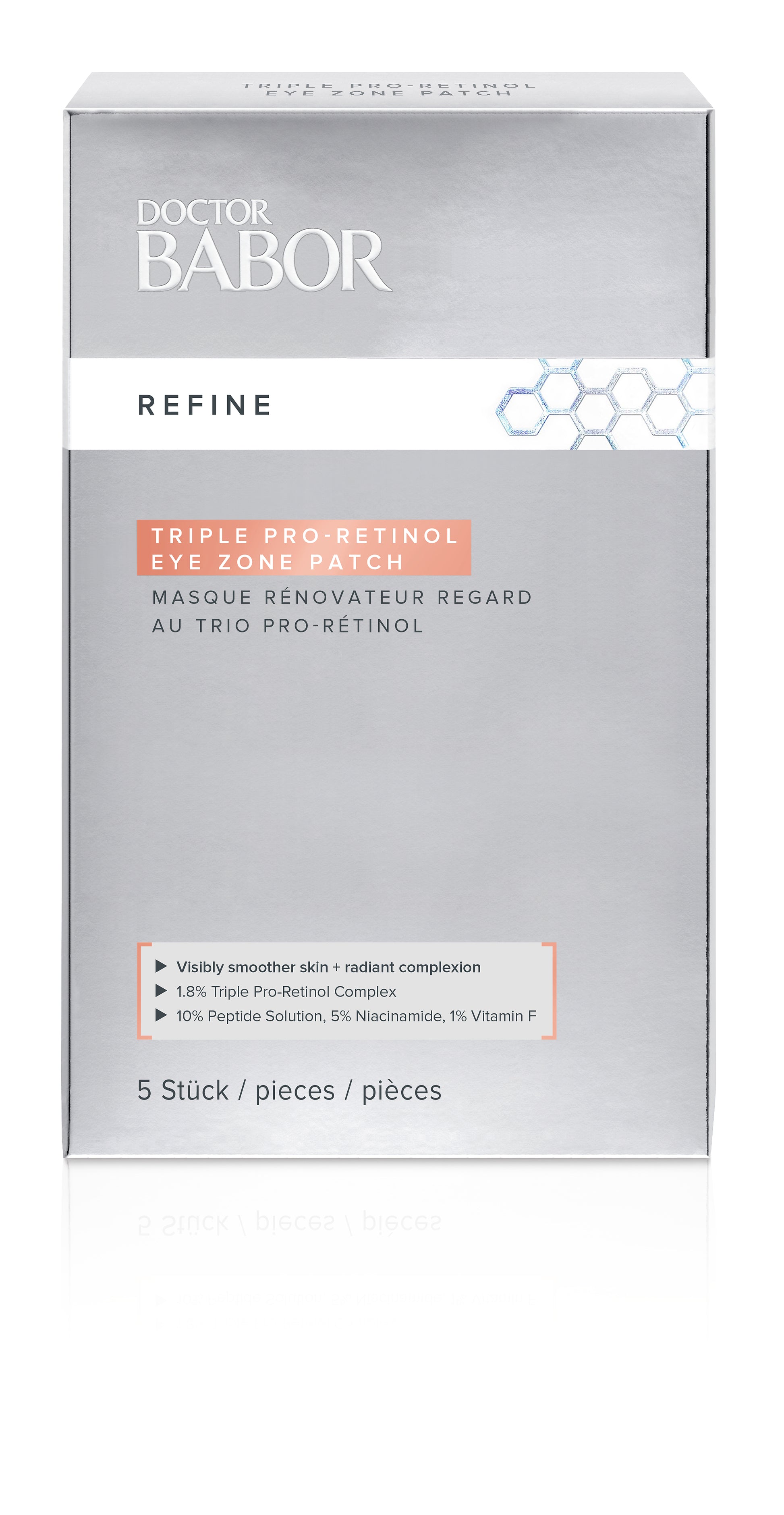 Specifically designed for the lower eye area, the upper cheek area, and the bridge of the nose, the DOCTOR BABOR eye zone mask gives skin a fresher, brighter, and more revitalized appearance thanks to the triple pro-retinol active ingredient complex and refining niacinamides.